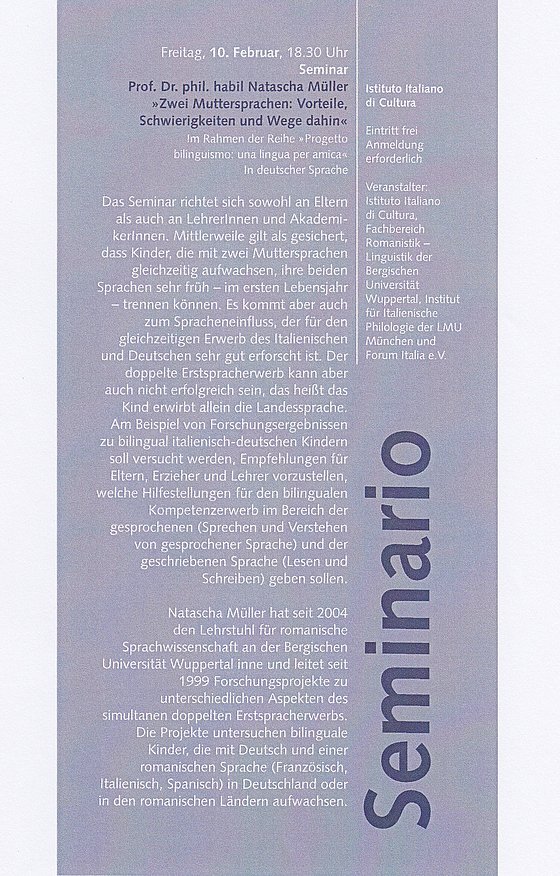 Ein Seminar (2012) von Frau Prof. Dr. Müller in Kooperation mit der BUW und des Instituto italiano di Cultura zum Thema: ,,Zwei Muttersprachen: Vorteile, Schwierigkeiten und Wege dahin".